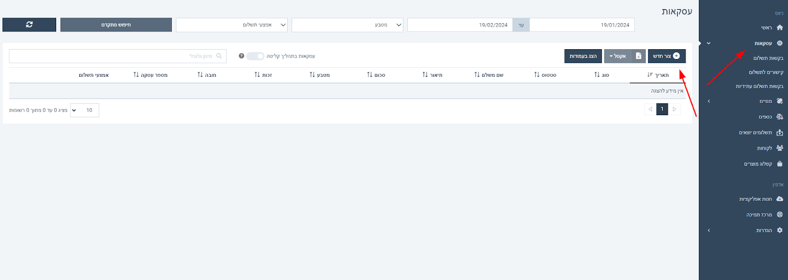 - תחילה יש ללחוץ על לשונית עסקאות -> צור חדש