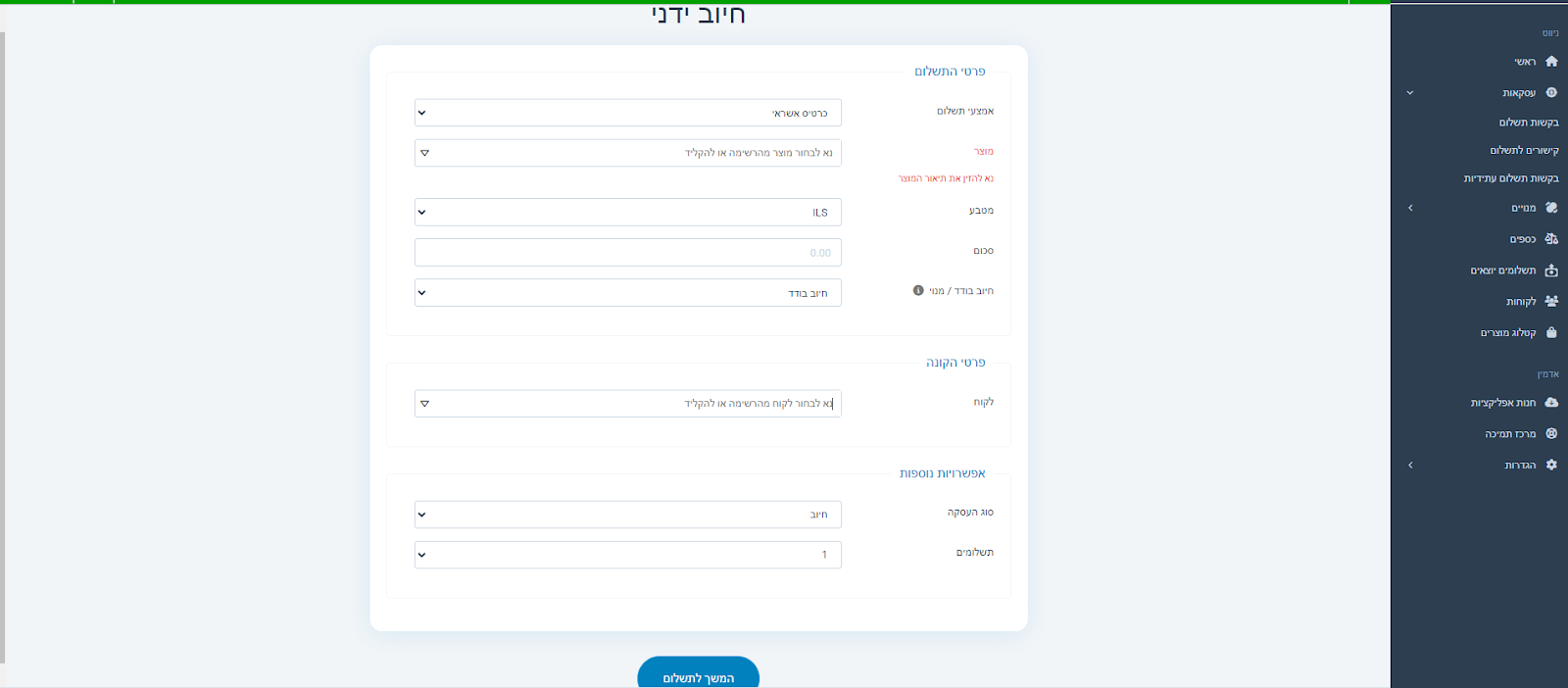 - יש לבחור בחיוב ידני