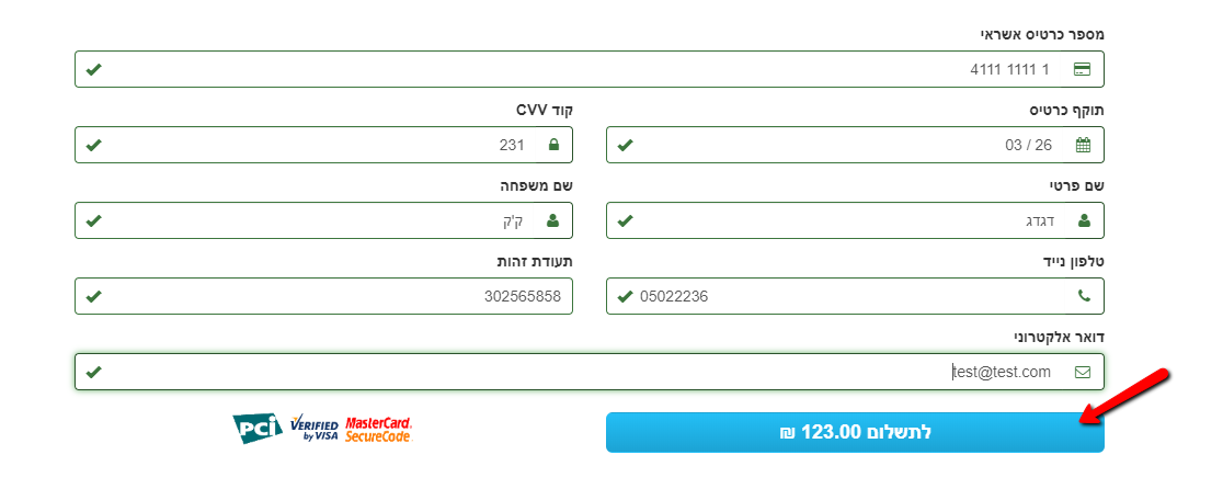 - נא להזין את פרטי כרטיס האשראי ובסיום יש ללחוץ -> לתשלום.