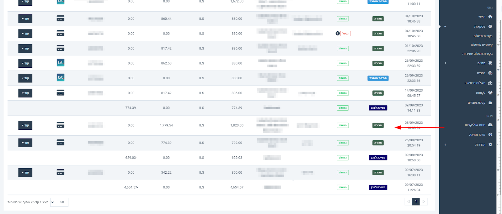 - תוכלו לראות בעמודת תשלומים את מספר התשלומים בהם העסקה תתבצע