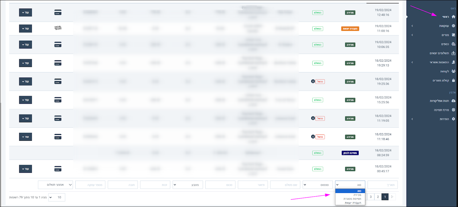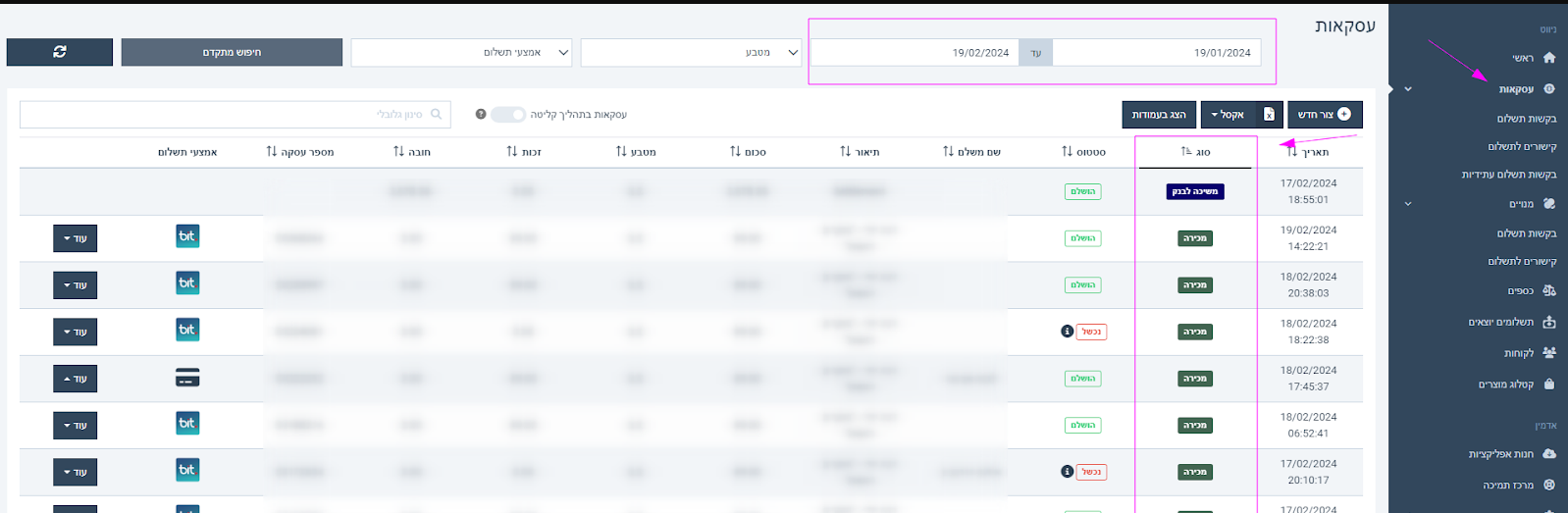 מדריך זה מפרט על סוגי העסקאות העיקריות בממשק הניהול שלך.