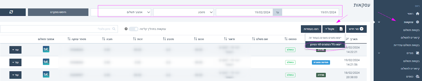 לאחר מכן יש ללחוץ על אקסל -> ייצוא כלל הנתונים לפי סינון: