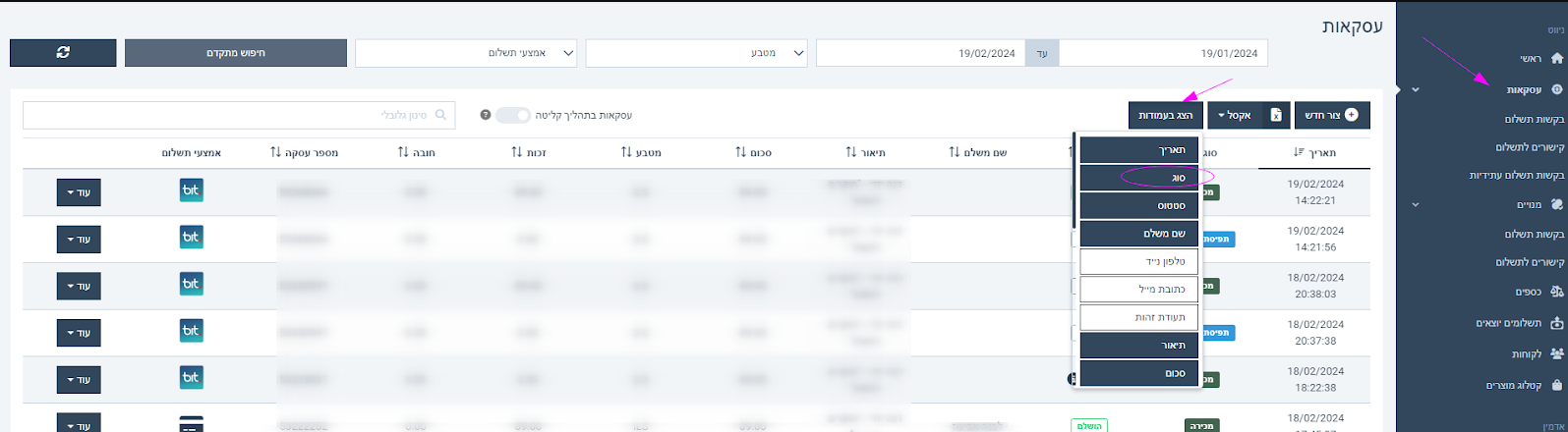 כדי לצפות בעסקאות עליך ראשית להתחבר לחשבונך -> לשונית עסקאות -> עמודה סוג.